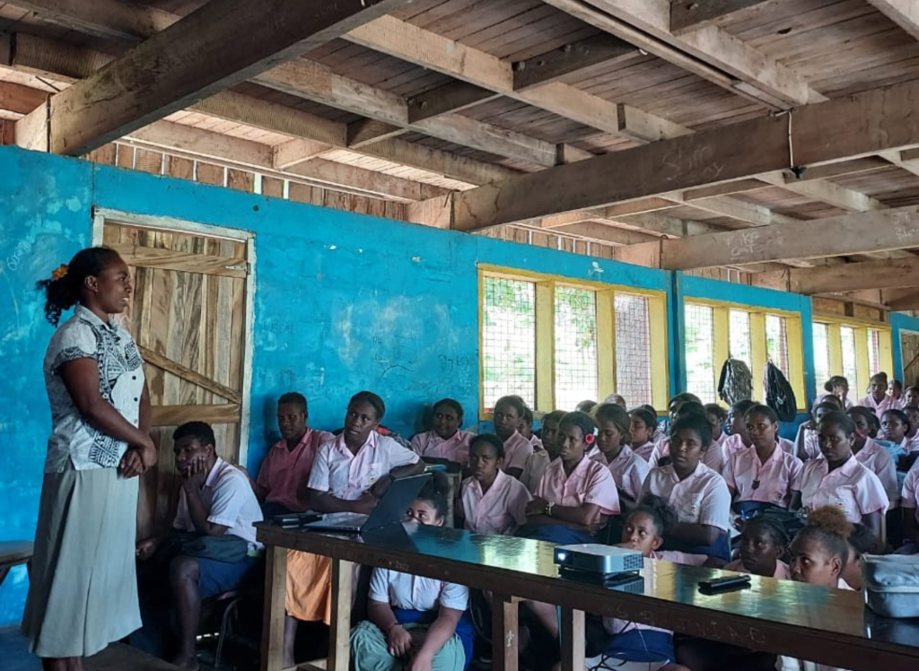 Feature image: Mary Tehekeni presenting to students of Visale Community School.